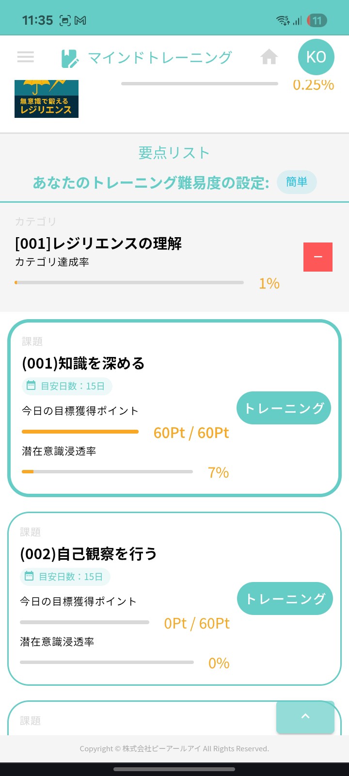 - 各要点に紐づく課題をそれぞれ一覧表示し、今日の目標獲得ポイントや潜在意識浸透率を確認することができます。